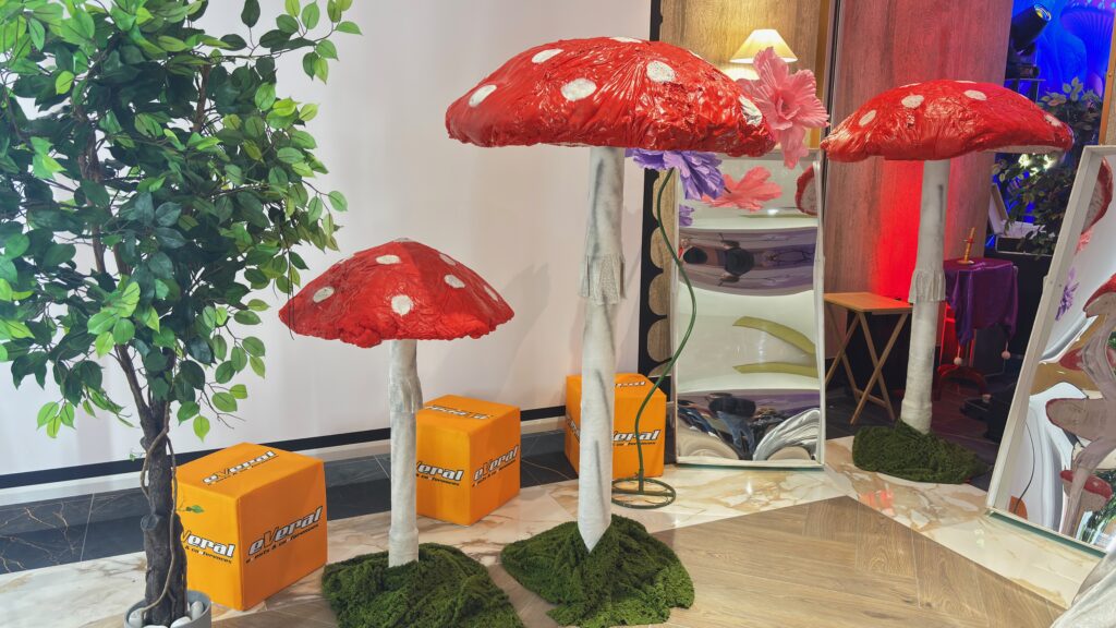 Tematyczne banery, które przywodzą na myśl świat Alicji, pełnią rolę wizualnej opowieści, prowadzącej uczestników przez różne etapy imprezy. Umiejscowione strategicznie, pomagają w utrzymaniu spójności tematycznej i wprowadzają gości w odpowiedni nastrój. Olbrzymie muchomory, jakby żywcem wyjęte z Krainy Czarów, stają się centralnym punktem scenografii, nie tylko jako dekoracja, ale także jako miejsce spotkań i rozmów. Ich obecność tworzy bajkowy klimat, a możliwość interakcji z tymi elementami dodaje wydarzeniu nowatorskiego charakteru. Dla wielu uczestników, takie widowiskowe dodatki stają się idealnym tłem do pamiątkowych zdjęć, które przypomną im o tej niesamowitej przygodzie.